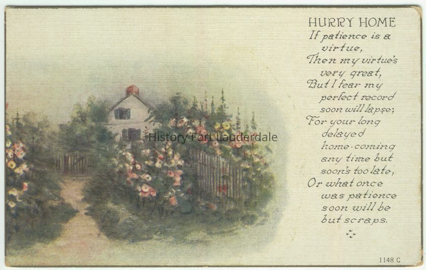 Image of house behind picket fence and rows of flowering plants. Poem on right side titled "Hurry Home." Thin gold border.