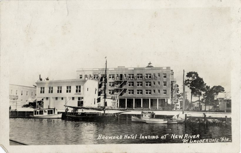 Looking north across the New River at the Broward Hotel building. Commodore Brook's sailboat Klyo docked at the landing.