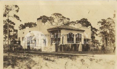 One-story Mediterranean Revival house with flat roof with parapet. Enclosed porch at front has hip roof with Spanish tiles. Two women standing in front of porch. Man and automobile along side of house.