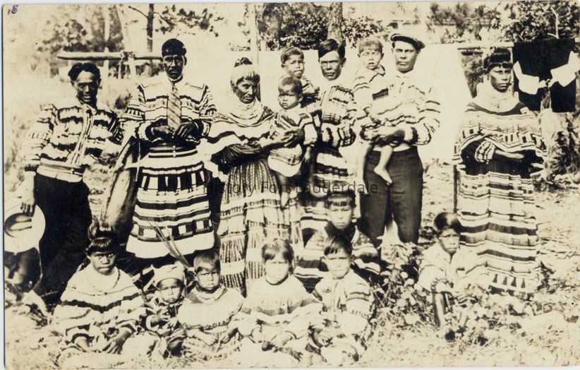 A group of Seminole men, women and children, taken in back of New River Hotel.