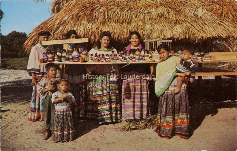 Eight Seminole women and children pose in front of chickee with table full of Seminole palmetto dolls and other crafts for sale at one of the sightseeing boat docks (probably the Jungle Queen) on the south fork of the New River, c. 1940s-50s. Left to right: Tudie Tommie, Pocahantus Jumper, Betty Mae Jumper, Laura Mae Osceola. Left front: Calvin Jumper, Daisy Jumper; girl holding baby is Pauler Jumper Cantu, Cantu is holding "Bigshort" (Moses Jumper Jr.?).