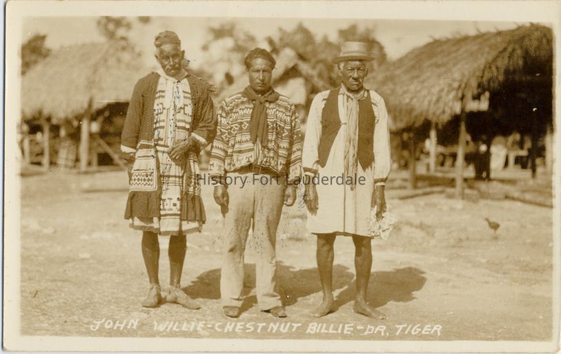 Three Seminole men (two elderly, one young). Chickees in background. Left to right: John Willie, Chestnut Billie, Dr. Tiger.