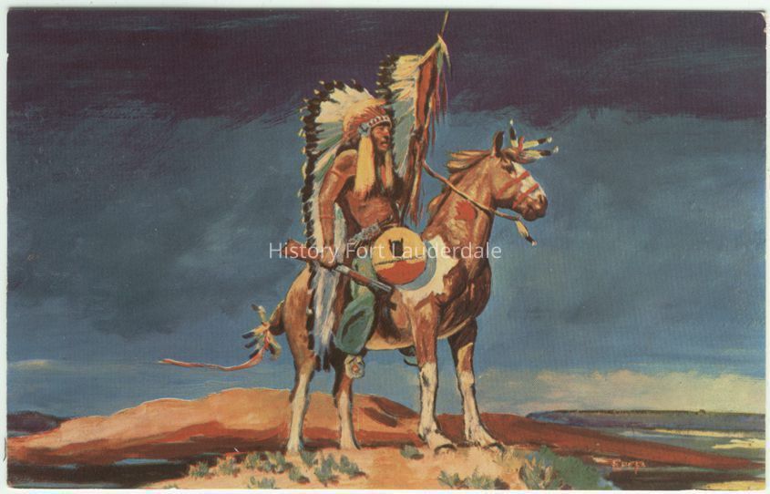 Painting of Native American man on horseback with full headdress, spear, and rifle. Full color reproduction from an oil painting by Tex Earp.