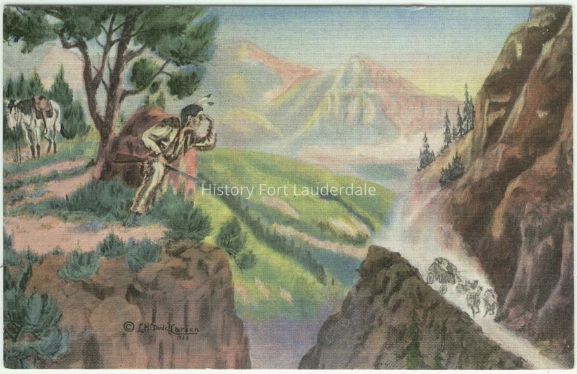 Native American man with rifle looks across canyon toward stagecoach. Taken from original oil painting by L. H. "Dude" Larsen. Poem on reverse: "On the Frontier."