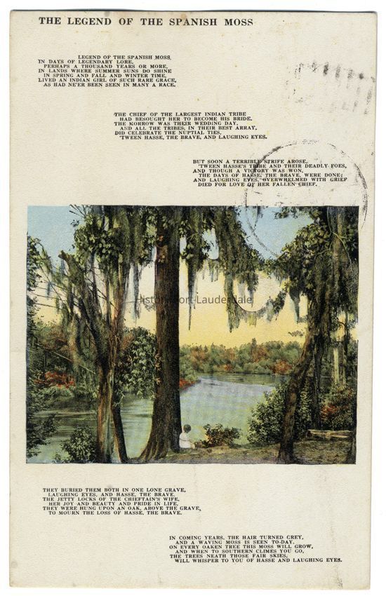 Image of trees with Spanish moss along water's edge. Verses of poetry ("The Legend of the Spanish Moss") above and below image.