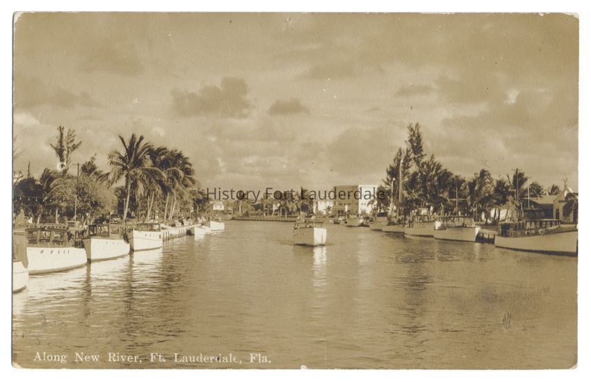 Looking east on New River from ~Andrew Avenue Bridge. Boats docked on both banks of the river. Dresden Apartments building in right center background. Single boat heading west on river.