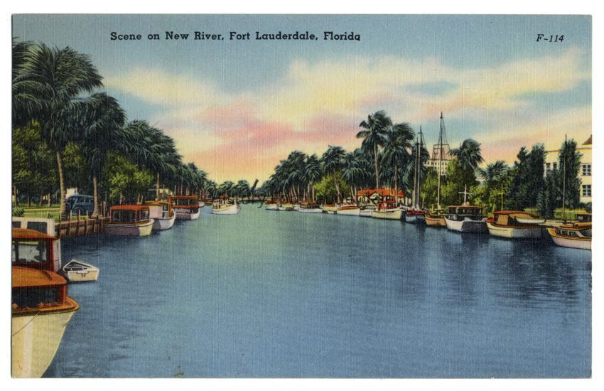 Looking west on New River towards the Andrews Avenue and FEC bridges from ~SE 3rd Avenue. FEC bridge in the up position in center background. Boats docked along both banks of the river.