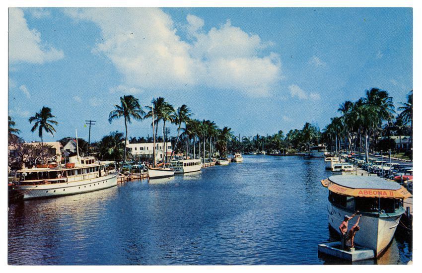Looking east on New River from Andrews Avenue bridge. Boats docked along the banks. Abeona II docked in lower right.