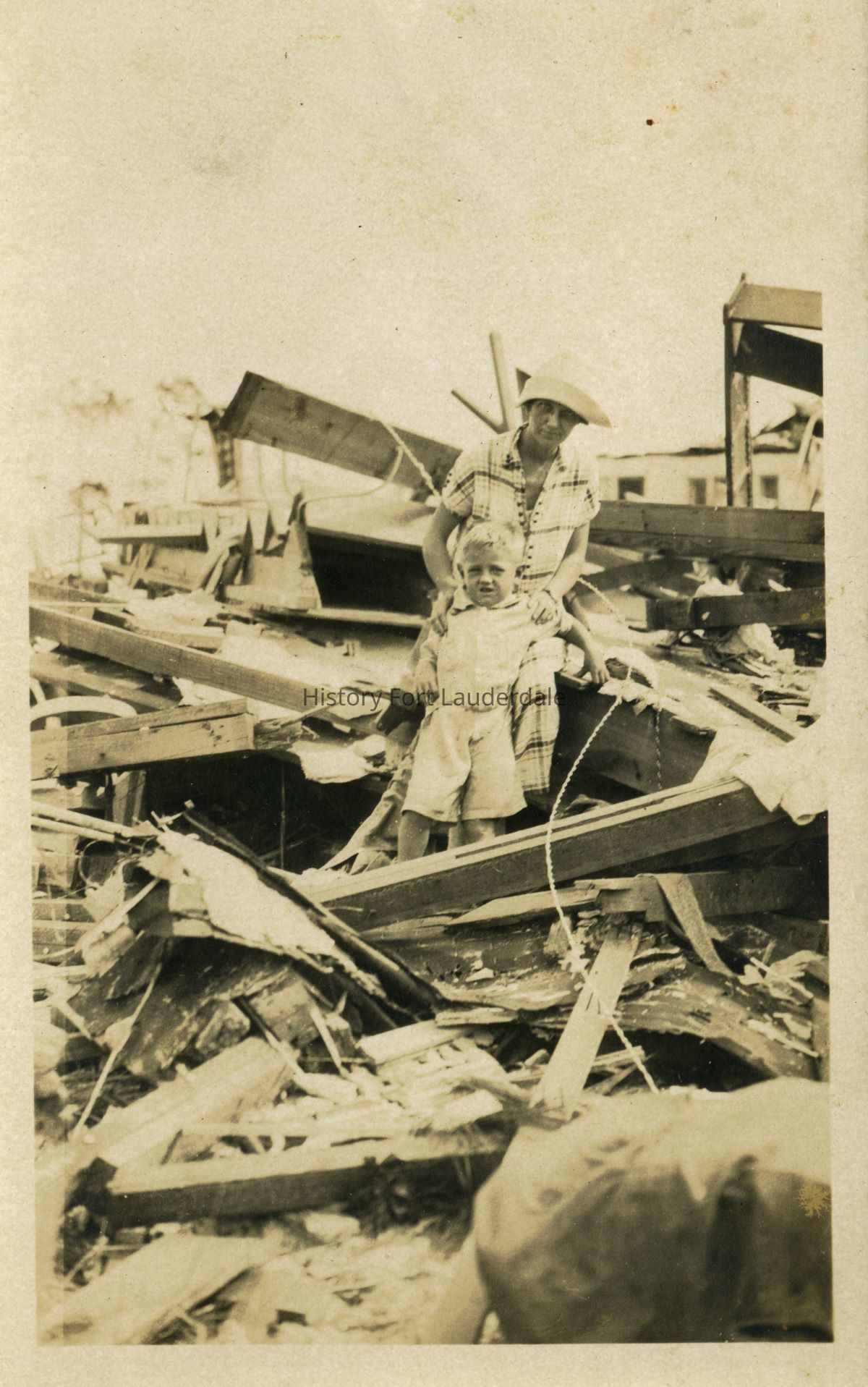 Woman and young boy standing in a pile of debris that was a building.Collection
