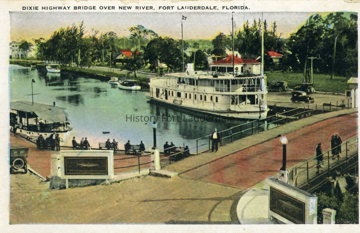 View of the second Andrews Avenue Bridge looking southeast from North River Drive. The steamboat "The Everglades" is docked on the south bank of the New River. Fish placards on entry to bridge. The man standing on the east (left) side of the bridge is Captain A. J. Canova (of The Everglades).Collection
