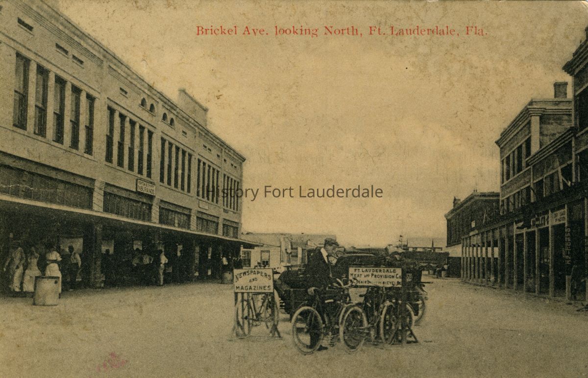 Looking north on Brickell Avenue from the New River. Cars parked in the middle of the street. Bicylce rack in the middle of the street. Oliver Building to the left. Bryan Building (background) and Wheeler Building to the right.Collection