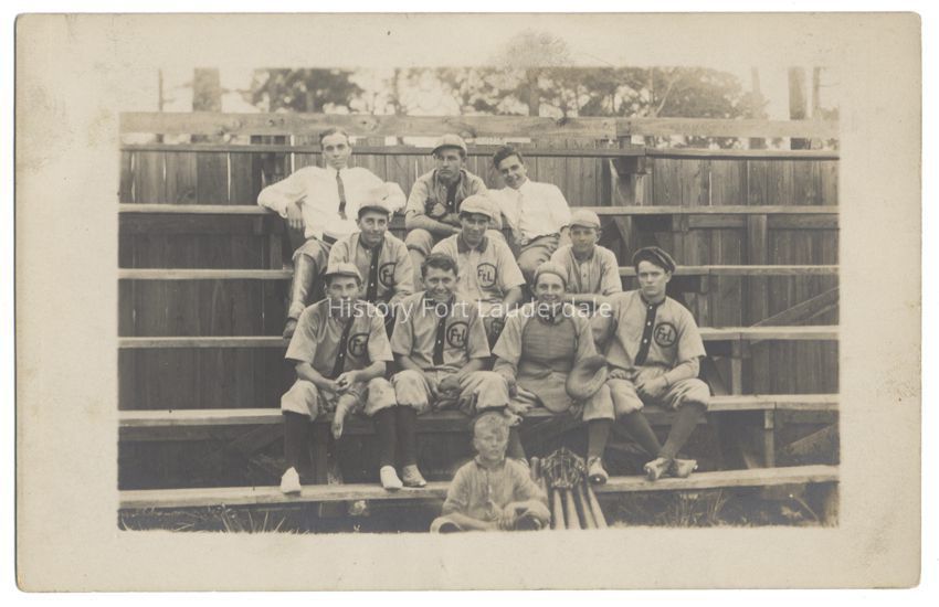 Fort Lauderdale Central High School Baseball Team Four rows of young men sitting on bleachers in baseball uniforms. Front Row: Charles Gordon (mascot). 2nd Row (l to r): Charles Crim, John Davis (pitcher), Martin Davis (catcher), K. Watt Gordon. 3rd Row (l to r): Walter Brock, Herman Gebiert, Glenn Fahrion. Top Row (l to r): Paul Weimer (coach), Roy Schull, Lawrence Rickard (manager). Real photo postcard. Black and white photo. Postally unused.