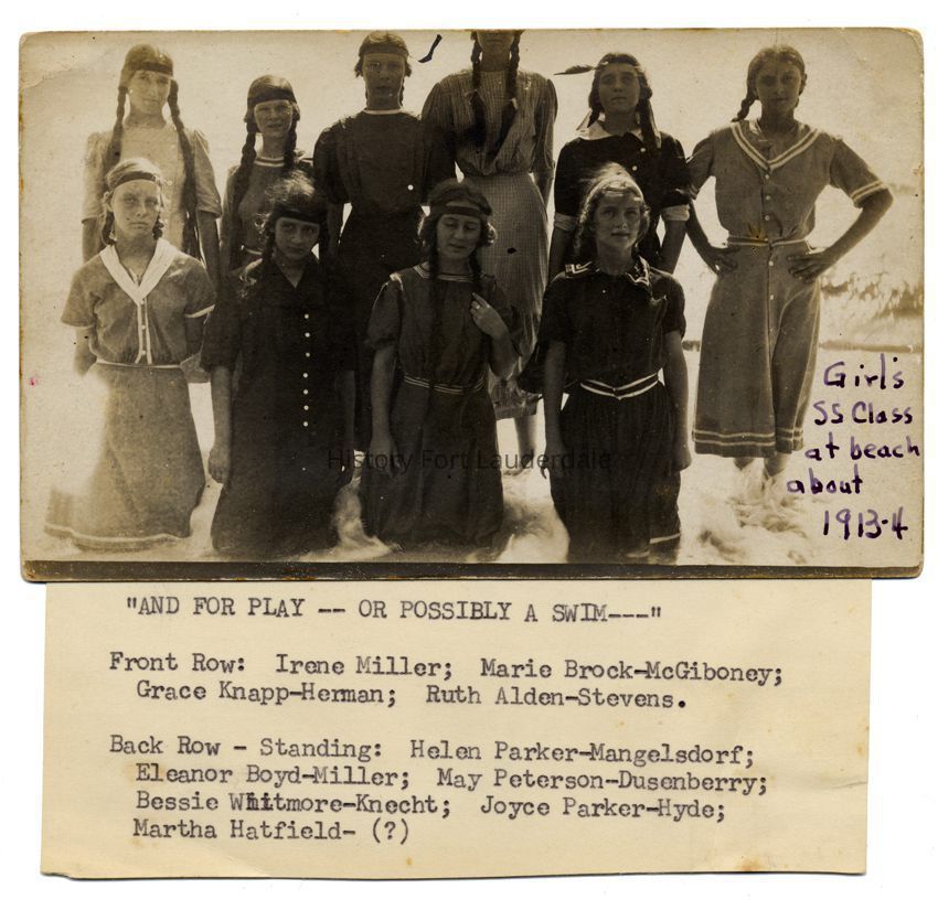 Girls Sundays School Class at beach about 1913-1914 Index card attached to lower front of the postcard lists individuals pictured. Front Row: Irene Miller; Marie Brock-McGiboney; Grace Knapp-Herman; Ruth Alden-Stevens Back Row - Standing: Helen Parker-Mangelsdorf; Elanor Boyd-Miller; May Peterson-Dusenberry; Bessie Whitmore-Knecht; Joyce Parker-Hyde; Martha Hatfield-(?) Black and white photographic image. Real photo postcard. Postally unused.