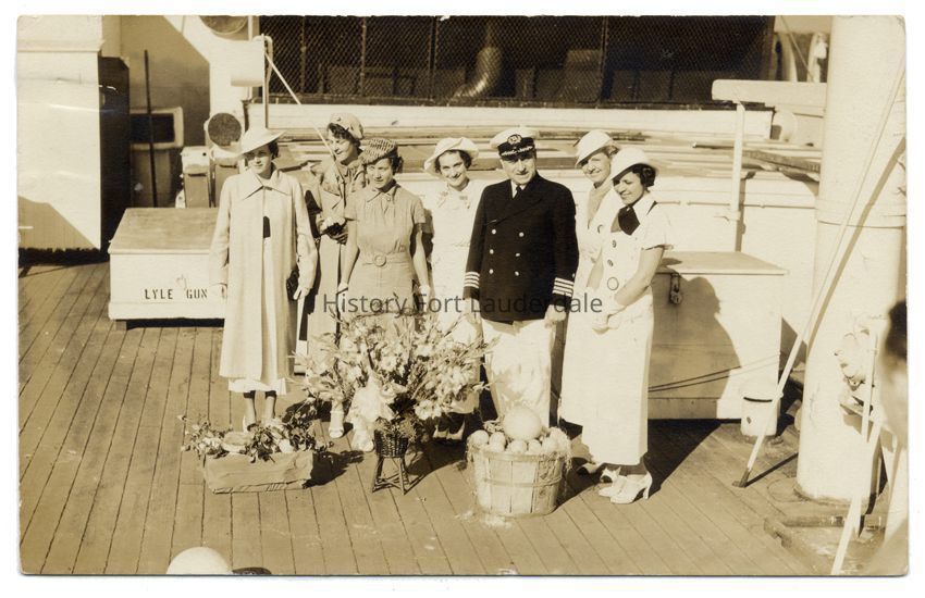 Six women standing with a man in a "naval" uniform on the deck of a ship. Flowers and fruit basket at their feet. Cruise Ship S.S. Columbia docked at Port Everglades.