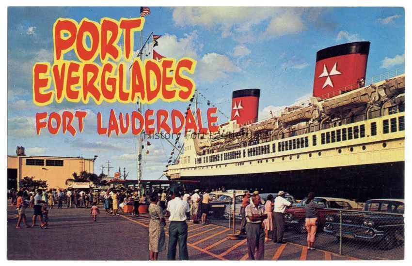 Many people in paved parking lot looking at large ship with two red smokestacks. "PORT EVERGLADES / FORT LAUDERDALE" in large red and yellow letters superimposed on photo.