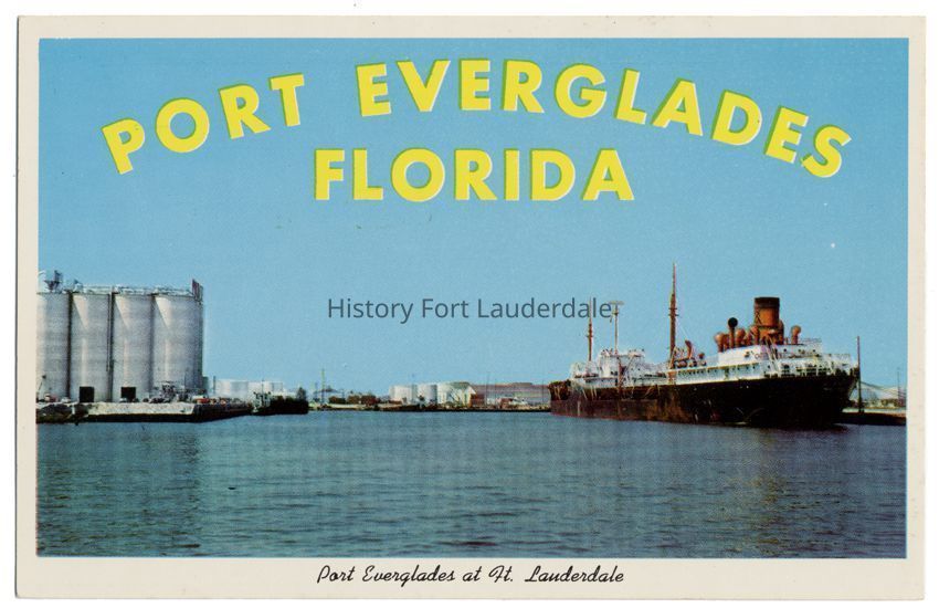 View from water of Port Everglades. "PORT EVERGLADES / FLORIDA" in large yellow letters superimposed on photo.