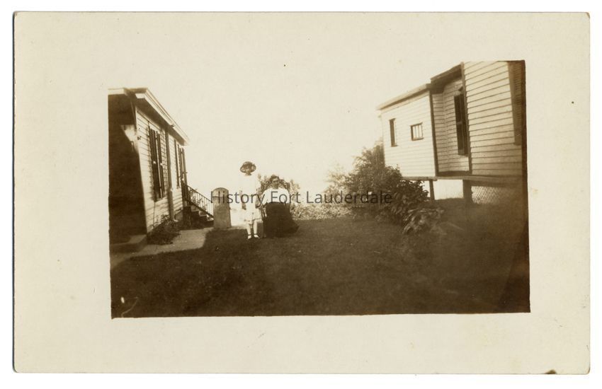 Unidentified woman, seated in chair, and girl, standing in hat and white dress, in yard between two houses.