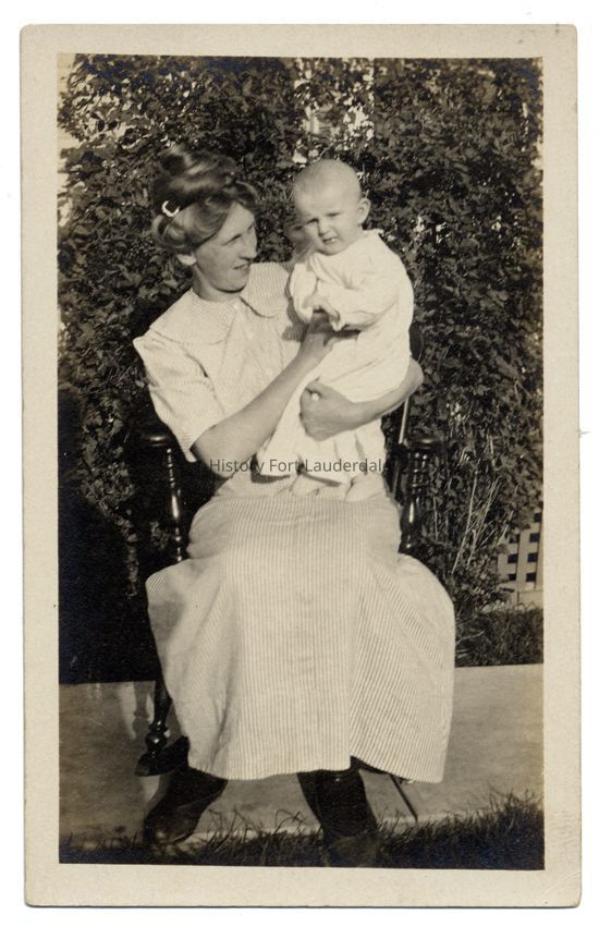 Unidentified woman seated in chair on sidewalk, holding baby.