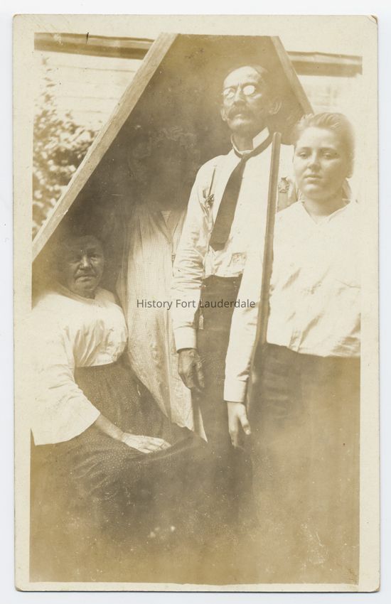 Four unidenitified people at opening of tent (?). One man, one boy (youth), and two women. Standing woman may be black.