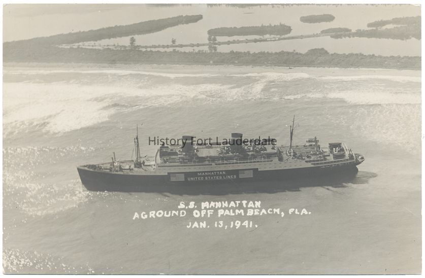 The MANHATTAN was built by the New York Shipbuilding Corp, Camden, NJ in 1930 for the United States Line. She was a 24,289 gross ton ship, length overall 705ft x beam 86.3ft, two funnels, two masts, twin screw and a speed of 20 knots. There was accommodation for 582 cabin class, 461 tourist class and 196-3rd class passengers. Launched on 12/5/1931, she commenced her maiden voyage from New York to Cobh, Plymouth, Havre, Hamburg, Havre, Southampton, Cobh and New York on 8/10/1932. In 1933 her funnels were heightened and on 8/23/1939 she commenced her last voyage from New York - Cobh - Plymouth - Havre - Hamburg - Havre - Southampton - Cobh - New York. She made three voyages New York - Le Verdon (Bordeaux) - New York between Sept. and Nov.1939 and in 1940 transferred to the New York - Mediterranean service for 6 round voyages. She then made a single NY - Lisbon - NY voyage and, on 8/10/1940 sailed from New York via Panama to San Francisco. From 1/12/1941 to 2/3/1941 she was aground on a sandbank off West Palm Beach, Florida, was refloated and in 1941 became the US Troopship WAKEFIELD. On 9/3/1942 she was damaged by fire in the North Atlantic, abandoned but later towed to Halifax. She was reconditioned at Boston as a permanent troopship and was eventually sold in 1964 and scrapped the following year at Kearny, NJ. [North Atlantic Seaway by N.R.P.Bonsor, vol.4,p.1550]