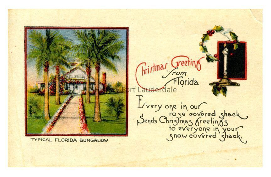 Image of "Typical Florida Bungalow" with palm trees along walkway. Candle and holly. Short poem.