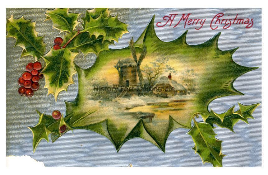 Scene of snow-covered house and windmill and pond on large holly leaf. Other holly leaves and berries against silver background.