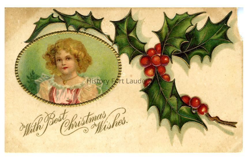 Colored image. Embossed. Divided-back postcard. Postmarked 12.23.1907, Garland, NC. Mailed to Mr. & Mrs. F. Stranahan, Fort Lauderdale, FL. One-cent green Benjamin Franklin stamp.Collection