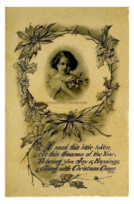 Christmas poem (by R. Y. M.) below image of white girl holding a flowering branch inside frame of poinsettia blossoms and holly leaves and berries.