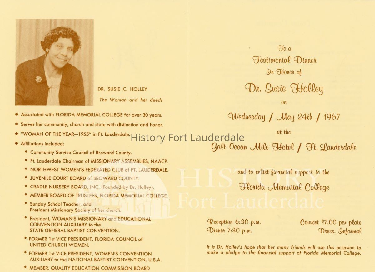Dr. Susie Holley was a woman of sound principles and a firm commitment to her cause, education and community service. Upon arriving in Fort Lauderdale in 1941, Dr. Holley was already an established leader. Through her teaching and fundraising efforts, Dr. Holley was instrumental in saving Florida Memorial College (Miami) during the Depression. She used her close affiliation with the Baptist Church to unite funding sources and keep the school operational. During this time Dr. Holley came to hold many positions within the Women’s and Educational Conventions of Baptist Church, and a seat on the Trustee Board of the Florida Memorial College.