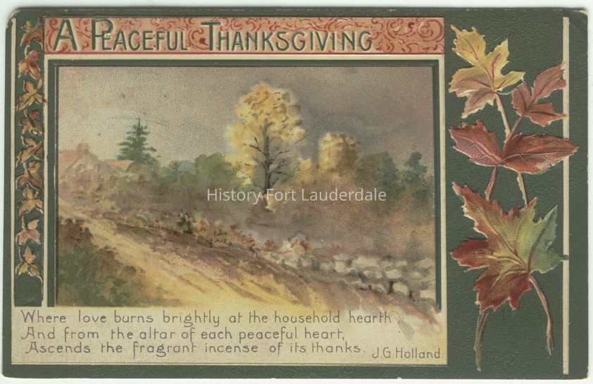 Fall scene on green background, bordered by fall leaves. Quotation from J. G. Holland.