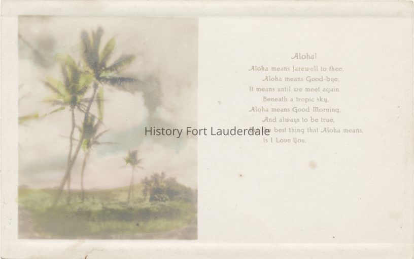 On left side, watercolor of palm trees. One right side, poem titled "Aloha!"