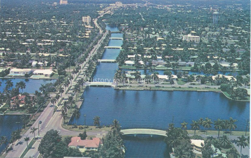 Aerial view of Las Olas Boulevard and finger islands, looking west. Water tower in upper right corner.