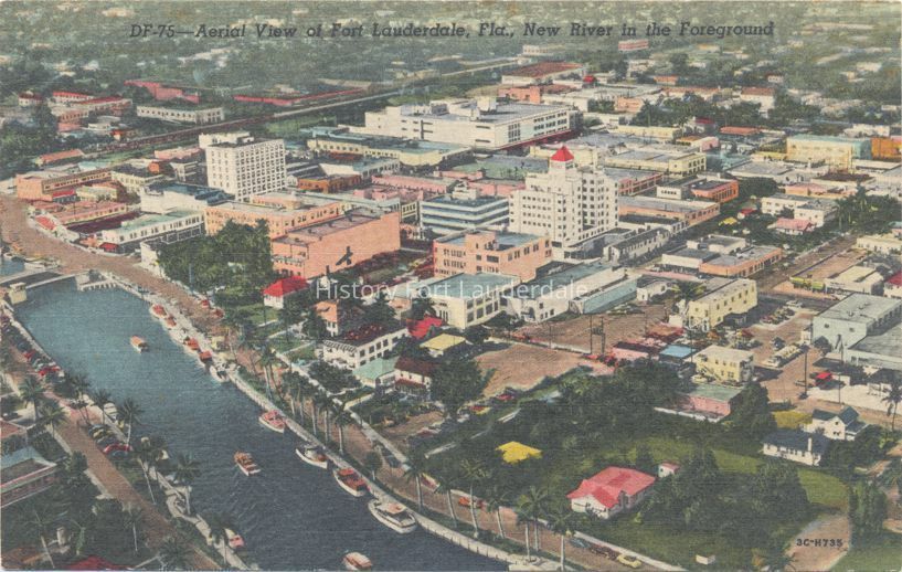 Aerial view looking northwest from ~SE 3rd Avenue. Andrews Avenue bridge at left center edge. Governor's Club Hotel in center. Sweet Building in upper left.