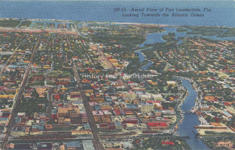 Aerial view of downtown Fort Lauderdale looking east. Showing New River, New River Inn, F.E.C. RR tracks, station & bridge, Andrews Avenue bridge, Sweet Building, etc. Atlantic Ocean in background.