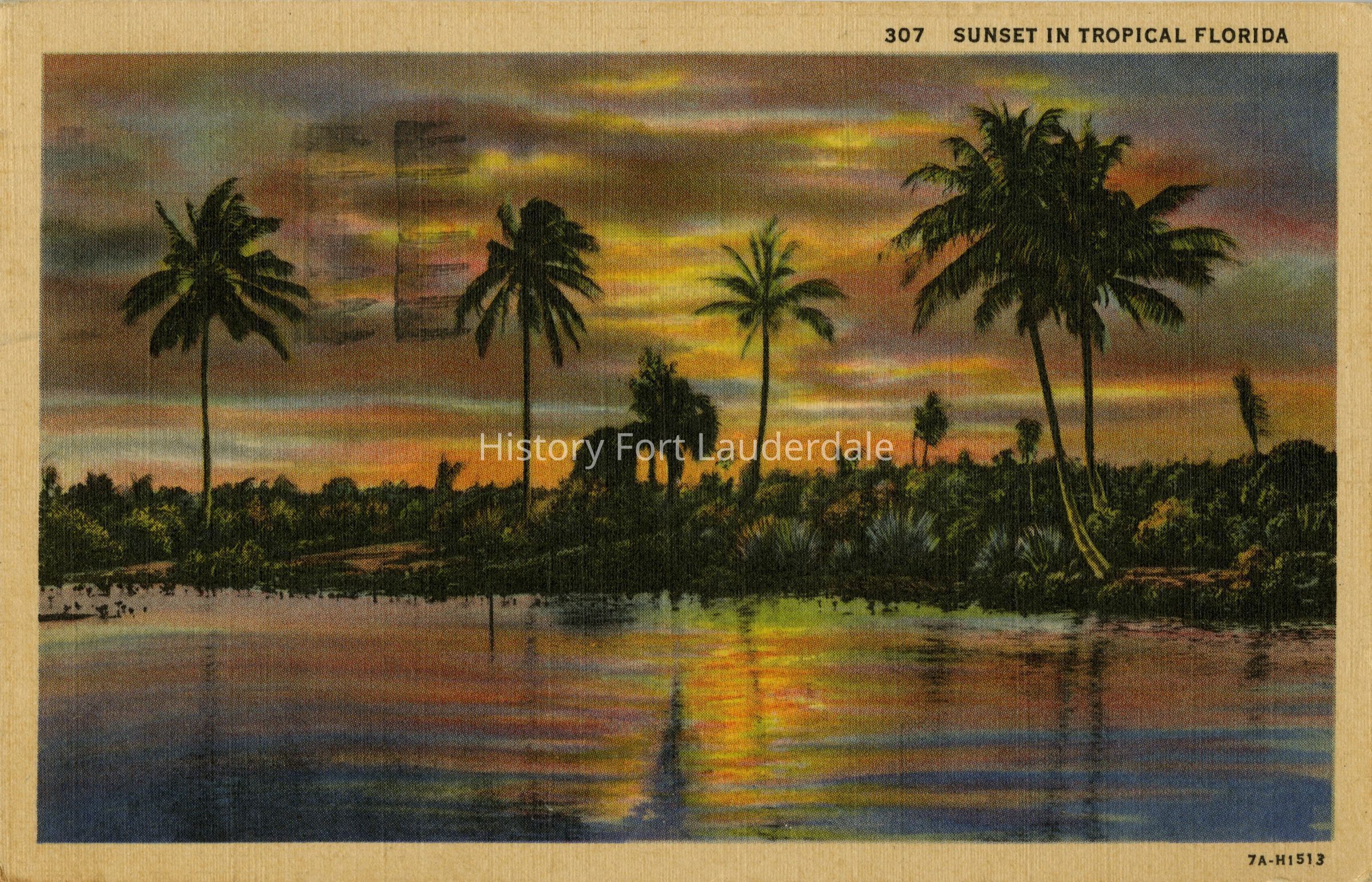 Orange and pink clouds, coconut palms and body of water. Short poem titled "In Florida" printed on reverse.