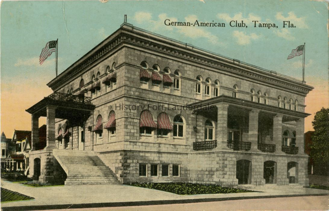 Three-story stone building. Two U.S. flags flying from opposite ends of building. Awnings on some windows.