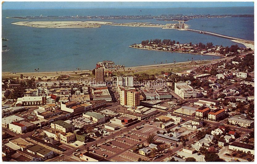 Aerial view of downtown Sarasota looking toward island-dotted Sarasota Bay and Gulf Beach recreation areas in background.