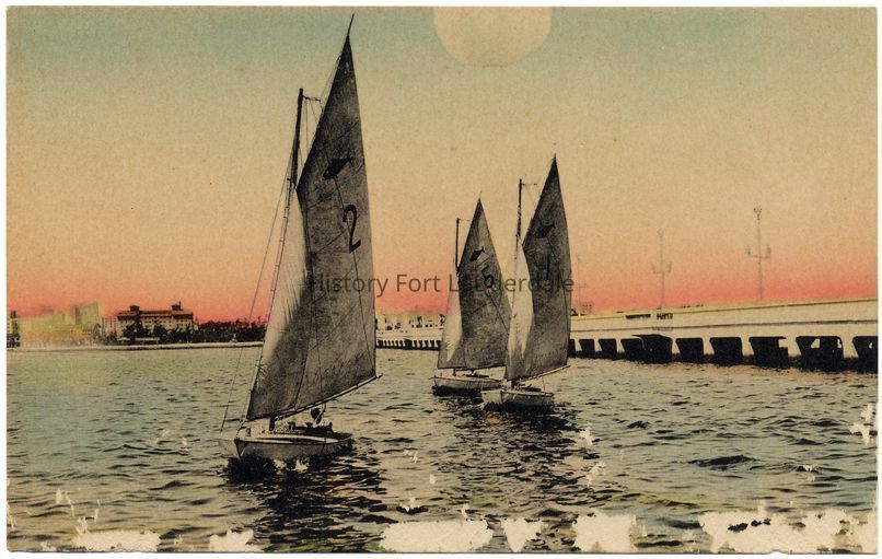 Three sailboats in front of long bridge/causeway. Pink sky in background.