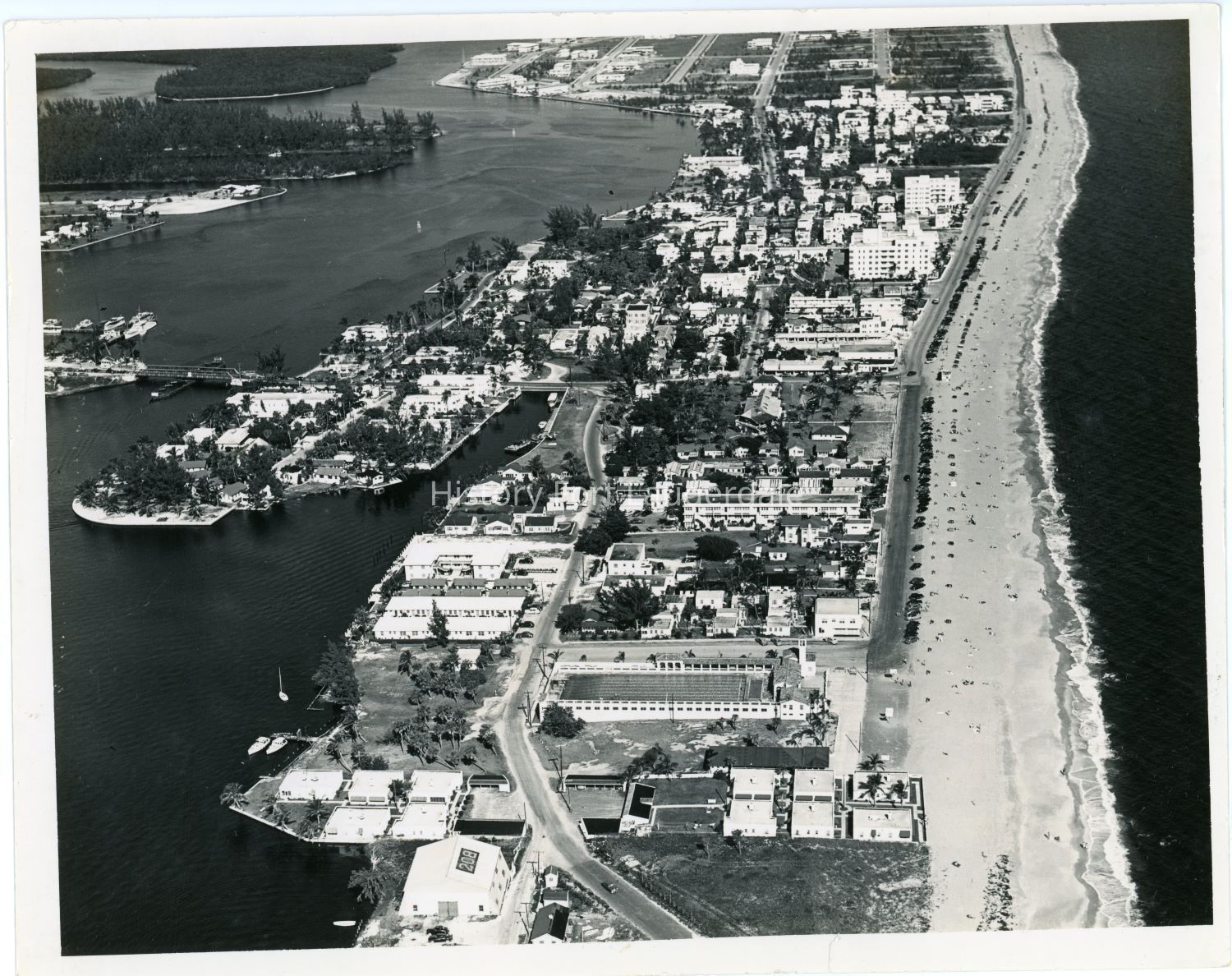 Aerial view of the beach looking north from the Casino Pool. Las Olas Boulevard (bridge) running left to right. Lauderdale Beach Hotel in upper right.Collection