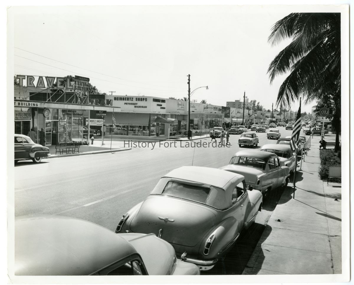 Looking west on Las Olas Boulevard from SE 11th Avenue. Cars parked along the street. Buildings/stores (l to r): Fort Lauderdale Travel Service and Reinhertz Shops.Collection