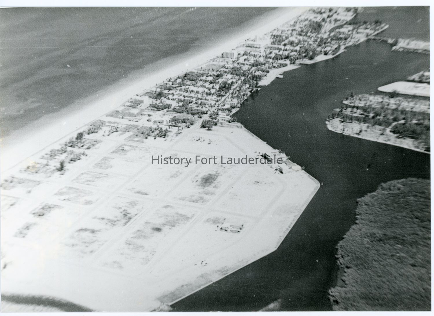 Aerial view of Birch Ocean Front subdivision looking southeast. Birch/Bartlett Estate in left foreground. Lauderdale Beach Hotel in upper center background. Las Olas Causeway in upper right background.Collection