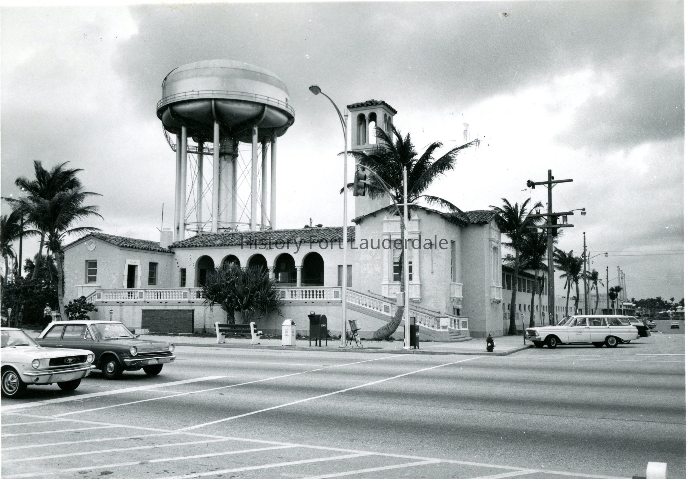View looking at the east facade of the Las Olas Casino showing stairway and tower. Water tower in left background.Collection