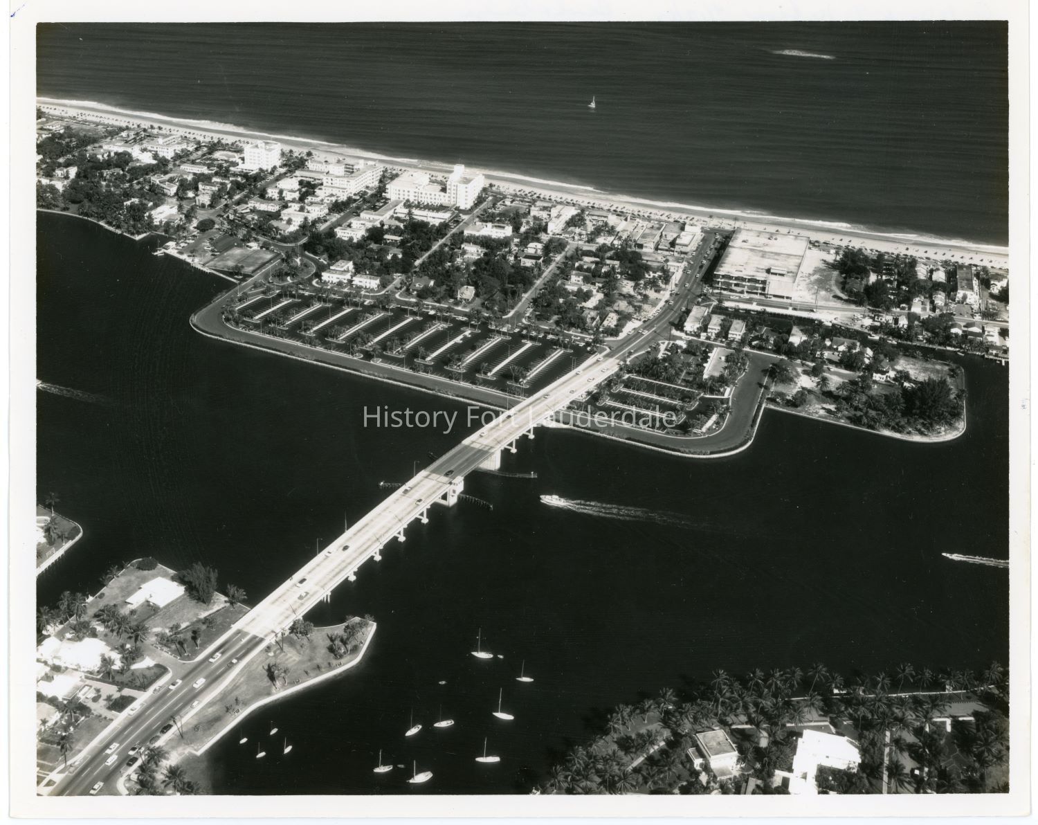 Aerial view of Las Olas Boulevard, Las Olas Bridge and the beach looking slightly northeast from west side of the Intracoastal Waterway. Lauderdale Beach Hotel in upper left center.Collection