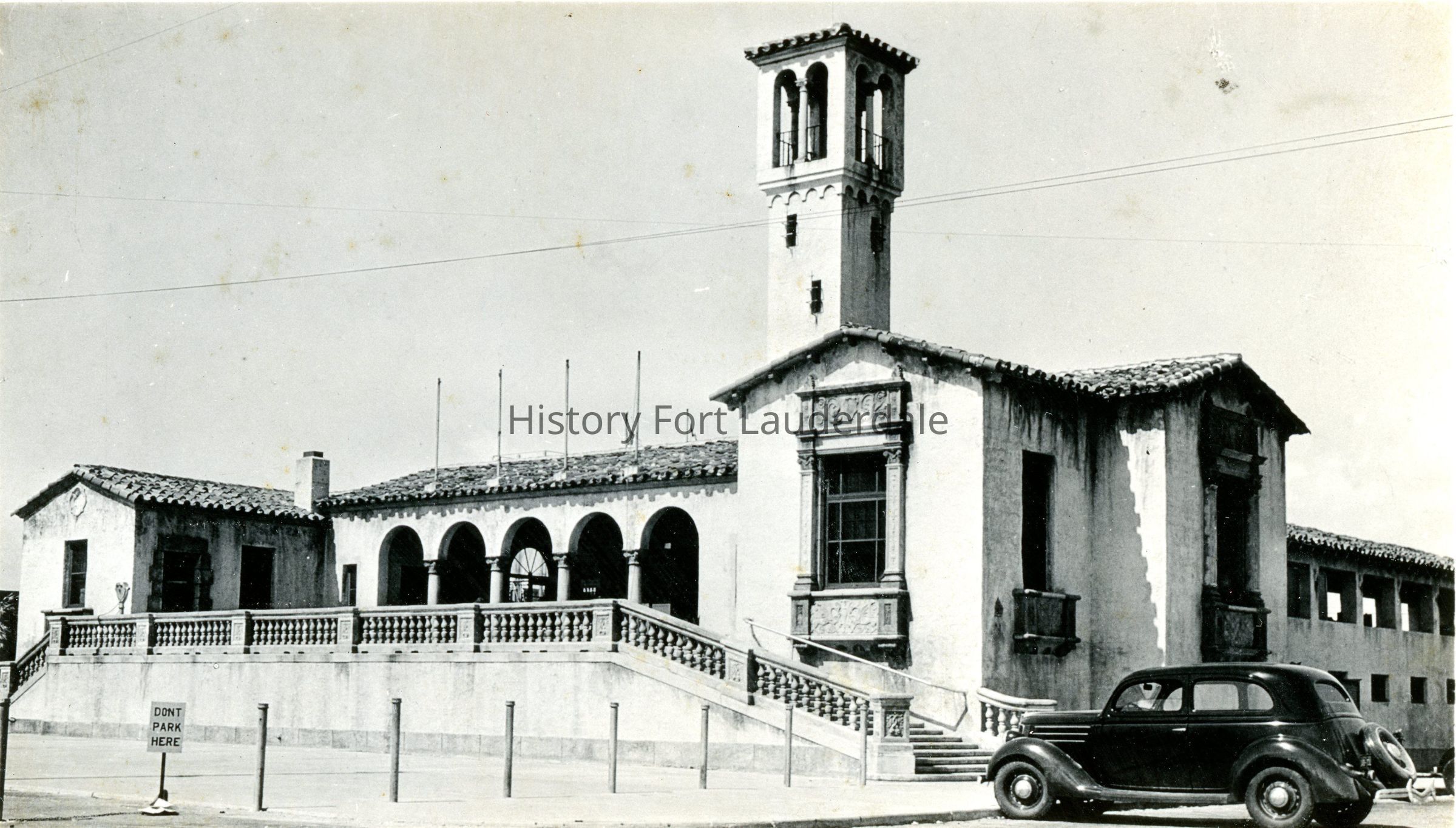 View looking at the east facade of the Las Olas Casino showing stairway and tower. Car parked in front.Collection