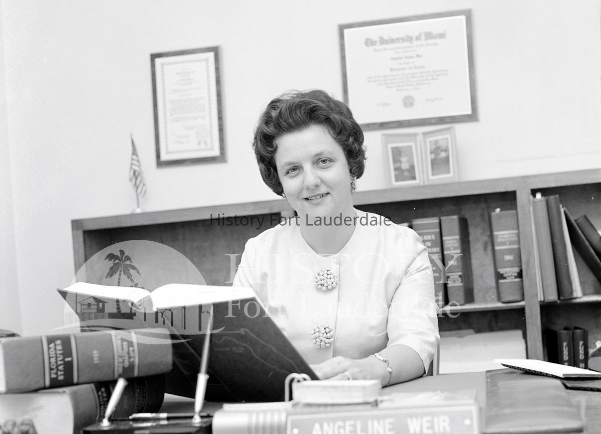 Angeline Weir moved to Hollywood, FL from Pennsylvania in 1952 after visiting the area with her husband for their honeymoon. As an assistant for the state’s attorney, Angeline was inspired to seek her own degree in the field. For four years Angeline split her time between her job as a librarian in the law library at the Broward County Courthouse, a homemaker, and the University of Miami. Obtaining her law degree in 1958, Angeline’s pride pushed her to encourage other women to pursue the field.