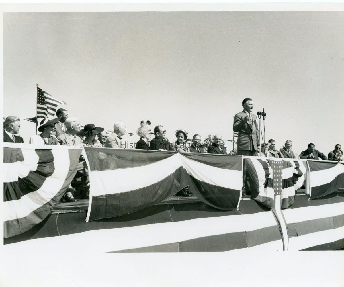 Man standing on podium, speaking at Pepper Park DedicationCollection