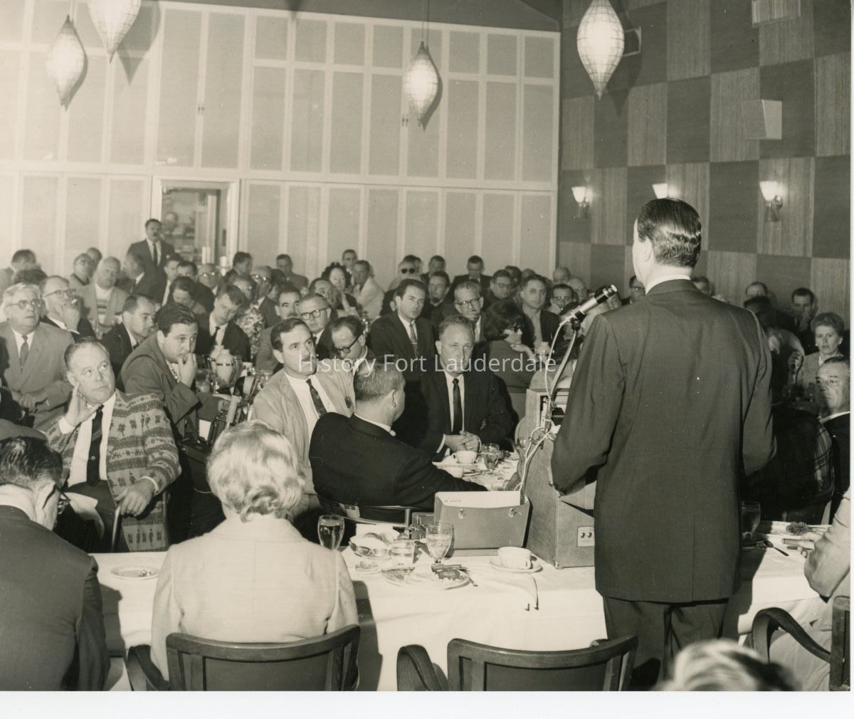 Man (possibly Fred Van Lennep) standing at podium, speaking to a crowd gathered at the Palm Aire Country Club.Collection