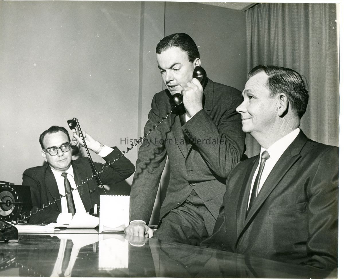 Three men sitting at a desk answering phones. Left to right: unknown, Fred Van Lennep, unknownCollection