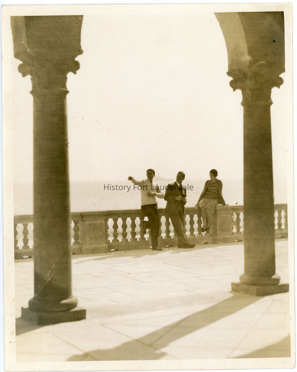 Francis L. Abreu, architect, (the man gesturing on left) being interviewed on the east patio at the Las Olas Casino Pool shortly before the casino's opening in February 1928. Ship in the background on the ocean. Identification was made by Peter Abreu (FLA's son).Collection