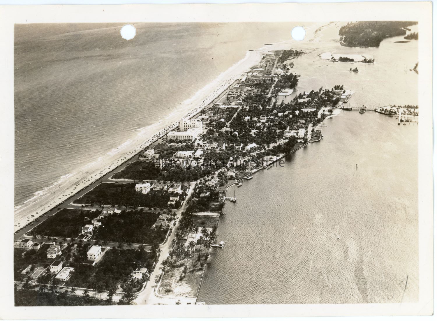 Aerial view of the beach looking south from Birch Estates. Lauderdale Beach Hotel in left center. Las Olas Boulevard Causeway near upper right. Coast Guard Base #6 and inlet in upper right center.Collection